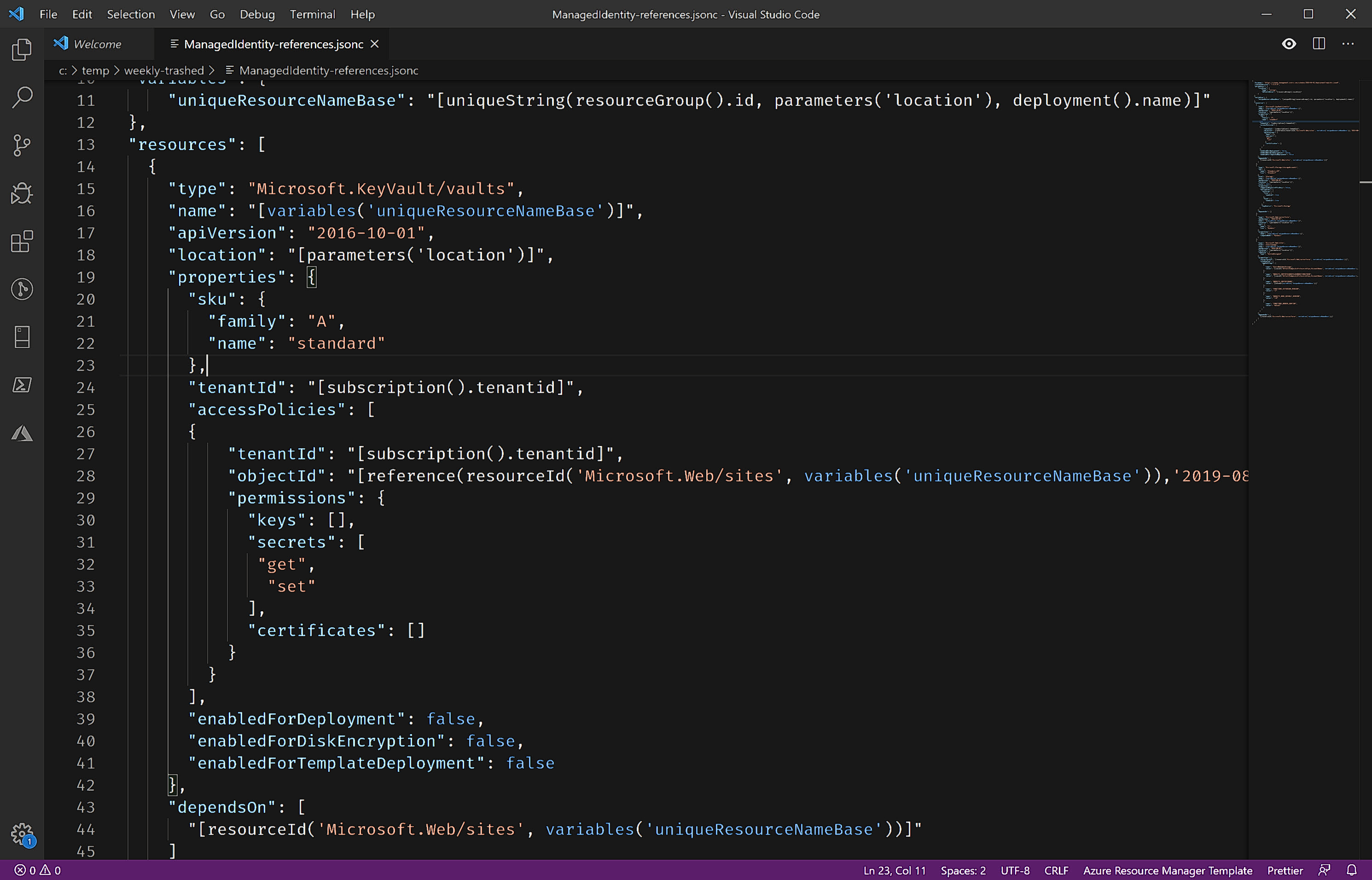 If you go to a resource in azure, any resource, you should be able to get the arm template from the left side menu. Arm templates also have a killer feature which is lacking in other solutions: We use arm templates to deploy resources to azure. Arm templates are based on json and follows a schema.